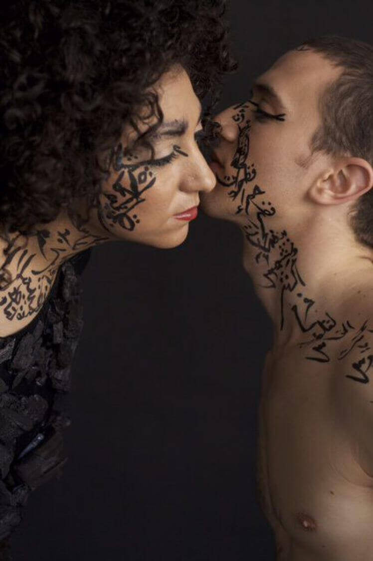 So werden zum Beispiel bei den im Buch vorgestellten Werken häufig Text und Textilien verwendet, zwei Formen, die typisch für die Region und für die jüdische sowie für die muslimische Kultur sind. Da es im Judentum und im Islam verboten ist, Skulpturen und Bilder zu schaffen, wurde die Schrift – der Text – ein künstlerisches Ausdrucksmittel. Beispiele hierfür finden sich in den Werken von Anisa Ashkar, die arabische Texte auf ihr Gesicht geschrieben hat; in Shula Keshets Portrait von David Ben-Gurion, dem ersten israelischen Premierminister, mit dem Titel „Wir brauchen Menschen, die als Arbeiter geboren wurden“; in „Setonfire“ (Angezündet) von Yoram Blumenkrantz, in dem die Buchstaben des hebräischen Alphabets und die Ziffern in einer Feuerinschrift erscheinen; in der Arbeit von Neta Elkayam mit dem Titel „Yehudiya“ (Jüdin), in der das Wort in Arabisch geschrieben und mit zwei Fischen verziert ist (die sowohl ein jüdisches als auch ein christliches Symbol sind); und in den Werken von Merav Sudai wie zum Beispiel „Inschallah“, in dem das Wort in Hebräisch und Arabisch geschrieben von Tapetenflecken und Ornamenten umrahmt ist.