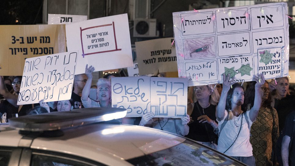 Es ist unmöglich, die Pandemie von den Balfour-Protesten zu trennen, unter die sich seit dem ersten Lockdowns im Frühjahr 2020 Corona-Leugner*innen mischten. Sie riefen Mitdemonstrant:innen dazu auf, ihre Masken abzusetzen, weil sie die Corona-Pandemie für eine Lüge hielten. Die führenden Köpfe der Bewegung hatten diese Ausreißer:innen jedoch stets beiseite gedrängt, weil sie fürchteten, die Demonstrationen selbst könnten Schaden nehmen. Mittlerweile sieht es so aus, als hätten diese Randgruppierungen nach dem Auszug Netanjahus aus dem Amtssitz den Mainstream erreicht. Sie reiten auf einer Welle des instinktiven Misstrauens und haben im Verlauf der Protestjahre immer mehr Anhänger*innen gewonnen.