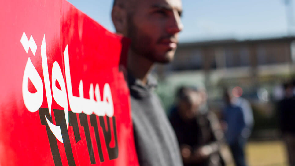 Protest gegen Hauszerstörungen und Räumungen in Israel (Auf dem Schild steht in Arabisch/Hebräisch: “Gleichberechtigung”), Jerusalem, 2017. Foto: Activestills