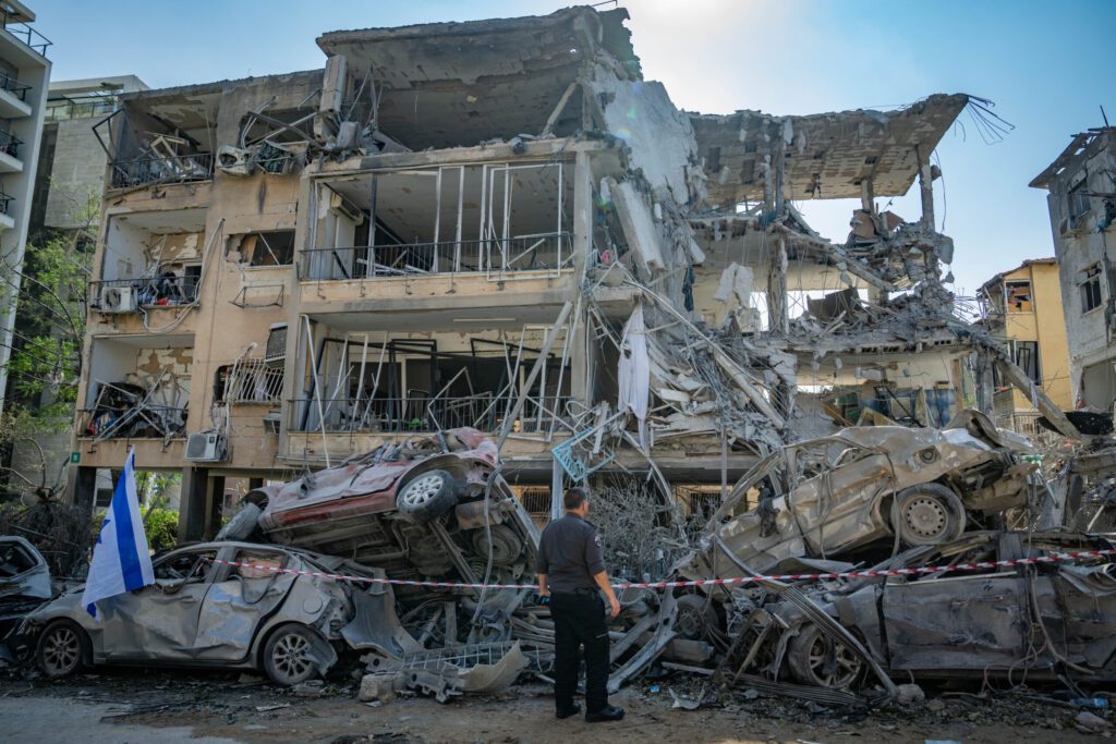 Die zionistische Linke verlässt sich prinzipiell auf die grenzenlosen Fähigkeiten des Militärs, und wird immer wieder enttäuscht. Die Ruine eines Gebäudes in Rischon LeZion, das von einer iranischen Rakete getroffen wurde. 14. Juni 2025. Foto: Oren Ziv