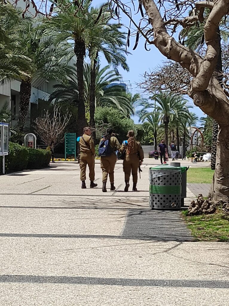 A group of soldiers in military uniforms sits on the lawn outside the Faculty of Humanities at Tel Aviv University. Another cluster of armed, uniformed soldiers gathers at the entrance to the Faculty of Mathematics at the Hebrew University in Jerusalem. In a large hall at the University of Haifa, hundreds of teenagers sit listening to a lecture by Major General G., a senior military officer, about the various military-academic tracks to which they can apply. Programs which several university representatives – professors, administrators, and the like – also take the stage to praise. Two students sit in a class in The Technion Faculty of Aerospace Engineering. Later that day, they speak with recruitment representatives in a booth the arms company Elbit Systems has set up as part of a campus career fair. At Ben-Gurion University, several students talk with recruitment representatives from the Mossad (state security). A few steps away, another group chats with Shin Bet (intelligence agencies) recruitment agents. The students fill their pockets with chocolates from a transparent plastic bowl at the booth. At the laboratories of the Hebrew University of Jerusalem, chemists bend over an electron microscope and examine the structure and thickness of a layer revealed through the lens as part of an experiment with Rafael Advanced Defense Systems Ltd.