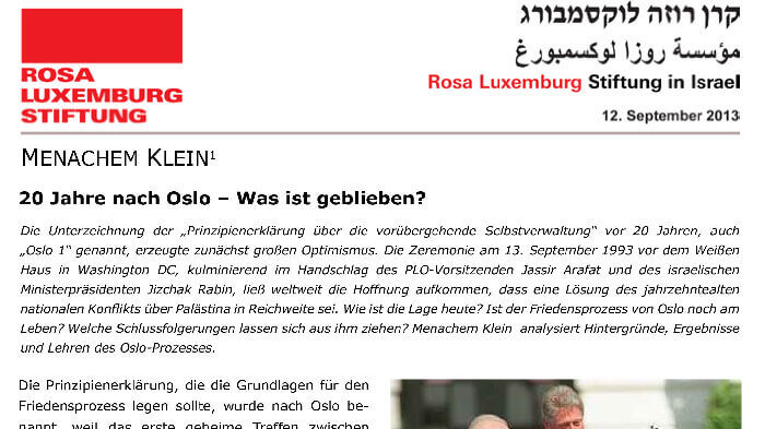 Die Unterzeichnung der „Prinzipienerklärung über die vorübergehende Selbstverwaltung“ vor 20 Jahren, auch „Oslo 1“ genannt, erzeugte zunächst großen Optimismus. Die Zeremonie am 13. September 1993 vor dem Weißen Haus in Washington DC, kulminierend im Handschlag des PLO-Vorsitzenden Jassir Arafat und des israelischen Ministerpräsidenten Jizchak Rabin, ließ weltweit die Hoffnung aufkommen, dass eine Lösung des jahrzehntealten nationalen Konflikts über Palästina in Reichweite sei. Wie ist die Lage heute? Ist der Friedensprozess von Oslo noch am Leben? Welche Schlussfolgerungen lassen sich aus ihm ziehen? Menachem Klein analysiert Hintergründe, Ergebnisse und Lehren des Oslo-Prozesses.